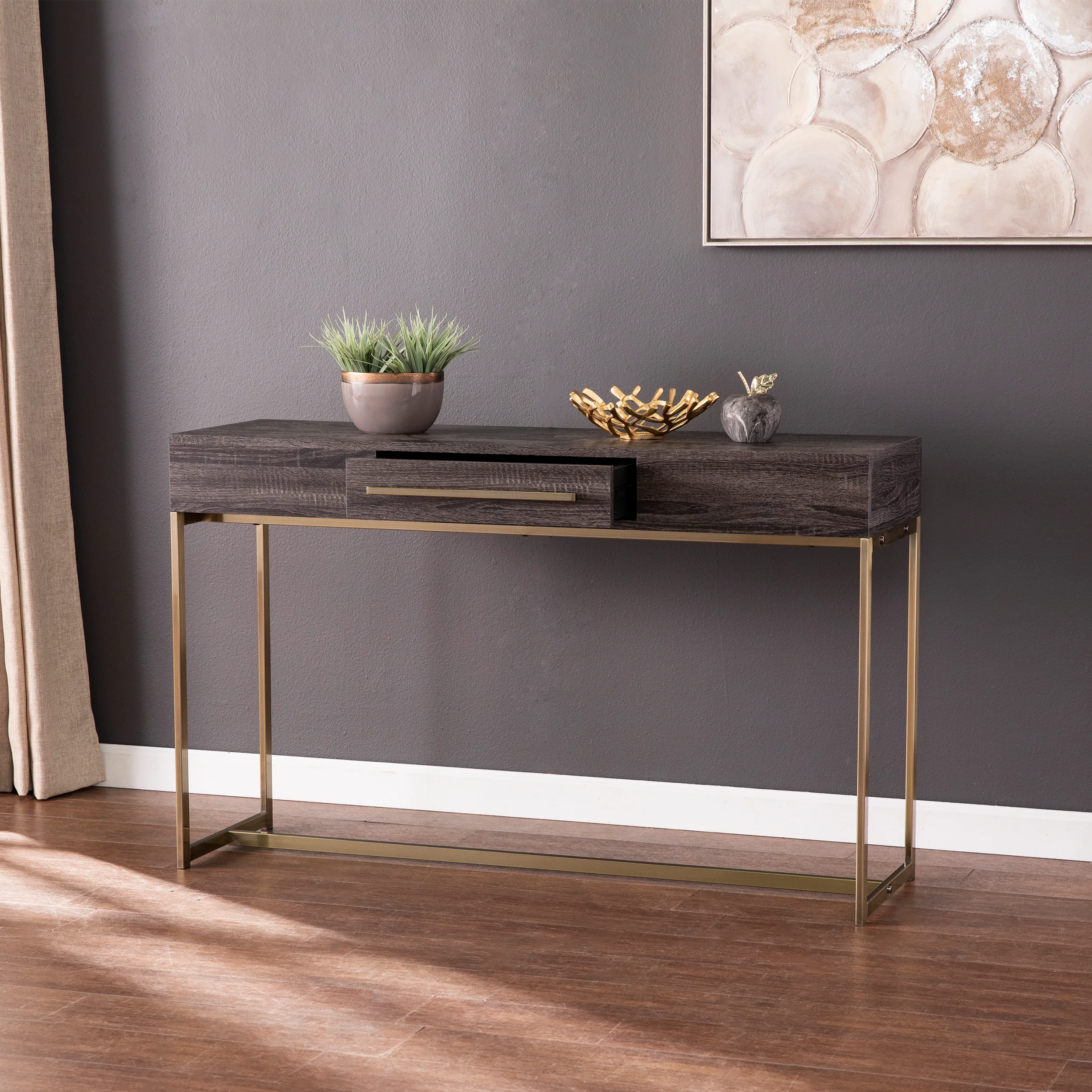 Stow everyday essentials with this narrow sofa table. A long tabletop provides a spacious landscape for potted succulents, modern décor, or book collections, while a sleek storage drawer tucks away keys and mail. A shiny metal frame highlights the mixed-material construction and crafts a chic two-tone look in your hallway or living room. Slide this skinny console table behind your sofa to corral TV accessories and tonight’s movie marathon list,or station in your entry to make a stylish first impression.