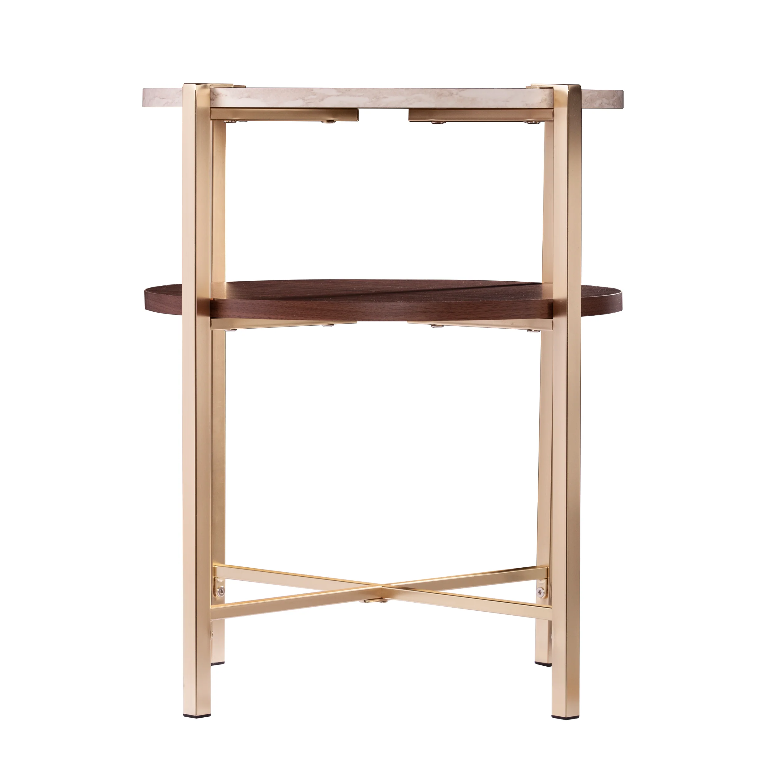 Double up on storage and style with this two-tier end table. Supported by a brass-finished metal frame and crafted with mixed-material design, this round accent table adds a unique look to your space. A reading lamp and cup of tea find their home onthe faux marble tabletop, while the lower shelf displays magazines and books. Place this small side table next to your favorite armchair for classy display storage within reach, or add to your open concept living space for aversatile accent to round out your interior design.