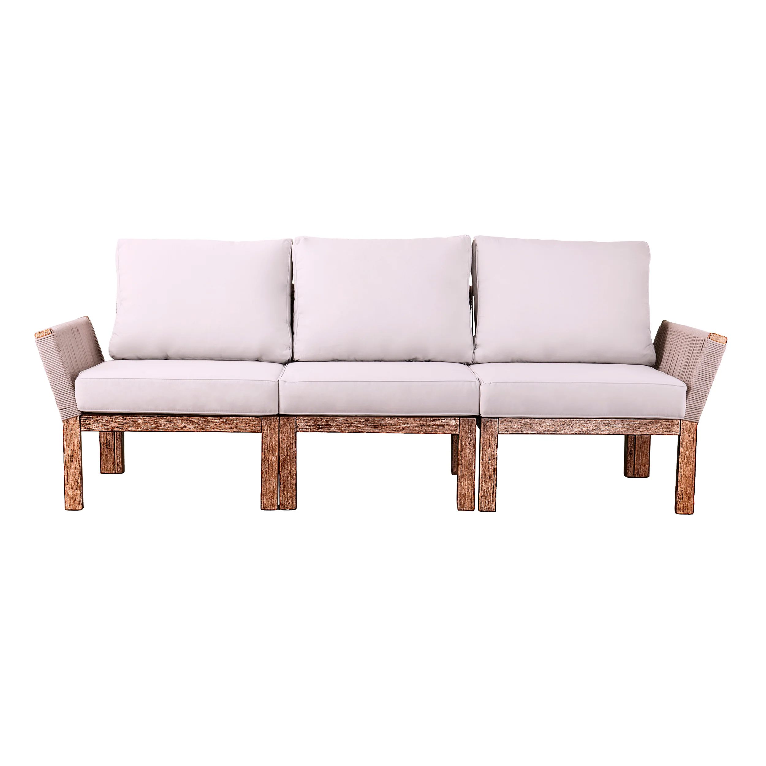 Modern texture meets a sleek silhouette with this outdoor sofa with cushions. Weather-resistant rope wraps up a sturdy acacia frame while you wind down, adding a natural color palette to your outdoor oasis. Plush cushions offer cozy comfort for watching the sunrise or partying under the stars, while the full-sized silhouette leaves ample space for family and guests to drop by. Slide this three-seater sofa onto your patio to serve up appetizers and summer cocktails, or add to your front porch to enjoy breezy mornings with your favorite read.