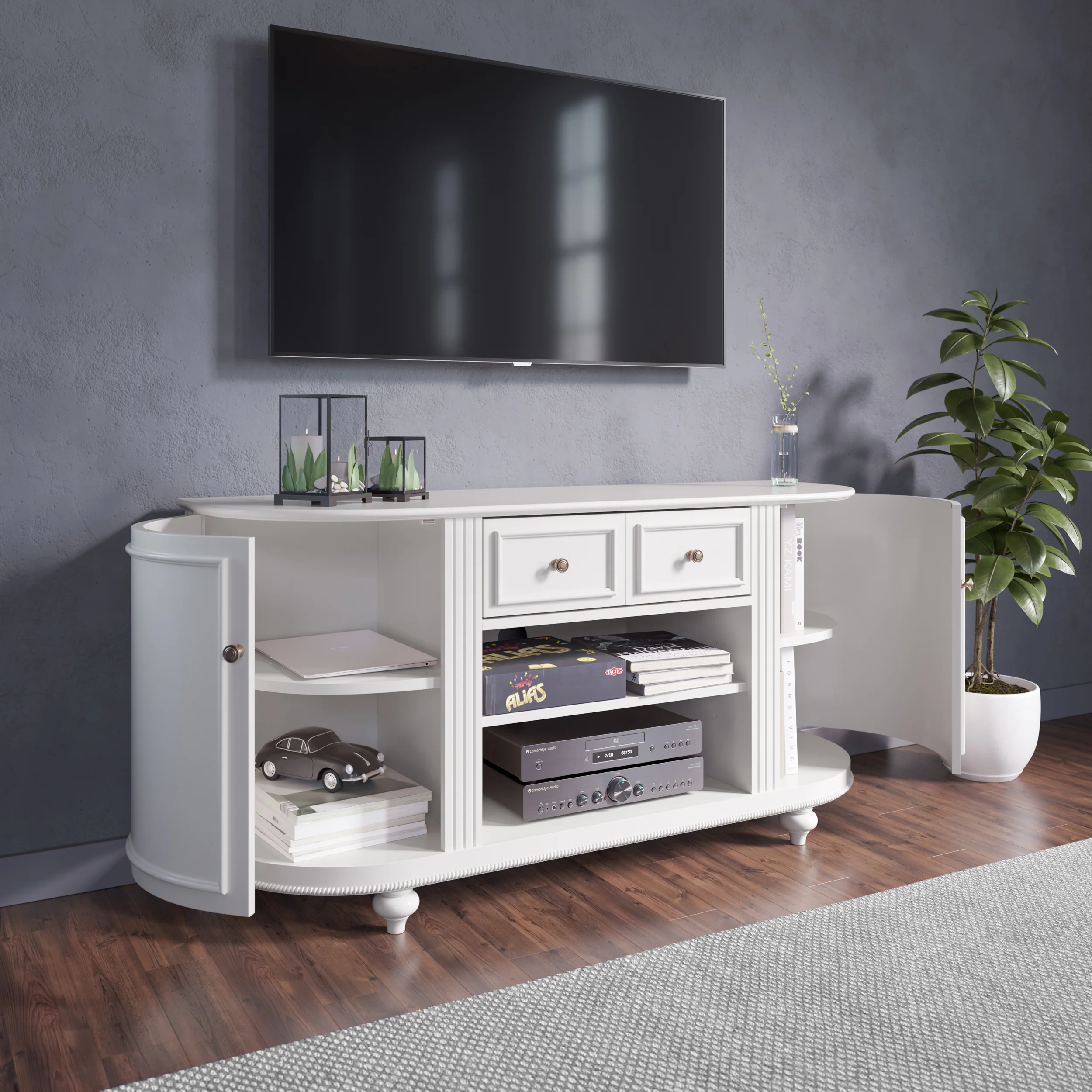 Invite classic style to your living space with this white TV console. Movies and books stay organized behind curved cabinet doors, while a drawer and two open media shelves keep remotes and electronics front and center. Traditional trim details pair beautifully with your living room sofa or family den, creating a cozy place to unwind or entertain guests. Bring versatile storage and classic design to your home with this TV media stand.